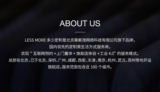 LESS MORE多少定制 2015年5月創(chuàng)立于北京,以互聯(lián)網(wǎng)思維和工業(yè)4.0切入服裝定制領(lǐng)域,獨(dú)創(chuàng)“互聯(lián)網(wǎng)預(yù)約+旗艦店體驗(yàn)+免費(fèi)上門量體+工業(yè)4.0 C2M生產(chǎn)”的模式,現(xiàn)已成為國(guó)內(nèi)服裝定制行業(yè)的標(biāo)桿品牌。